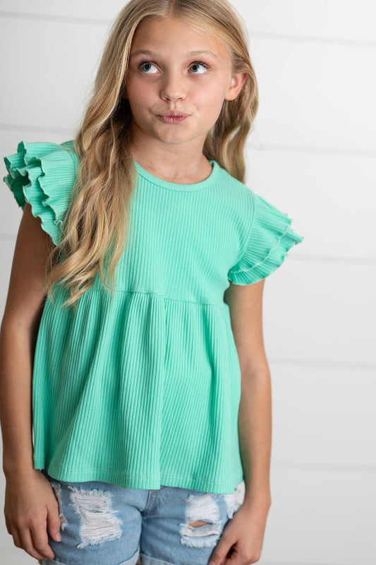 Aqua Double Ruffle Flutter Sleeve Top