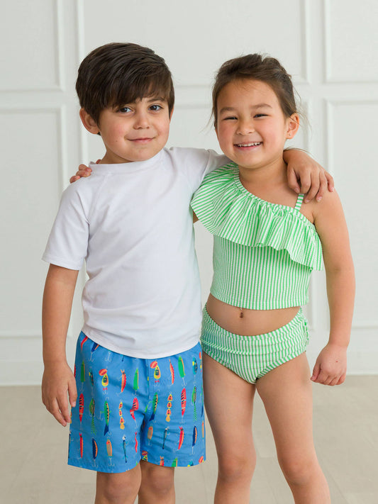 Spring Green Seersucker One Shoulder Ruffle Tankini