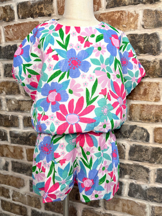 Floral Puff Sleeve Dolman Top + Smocked Shorts Set