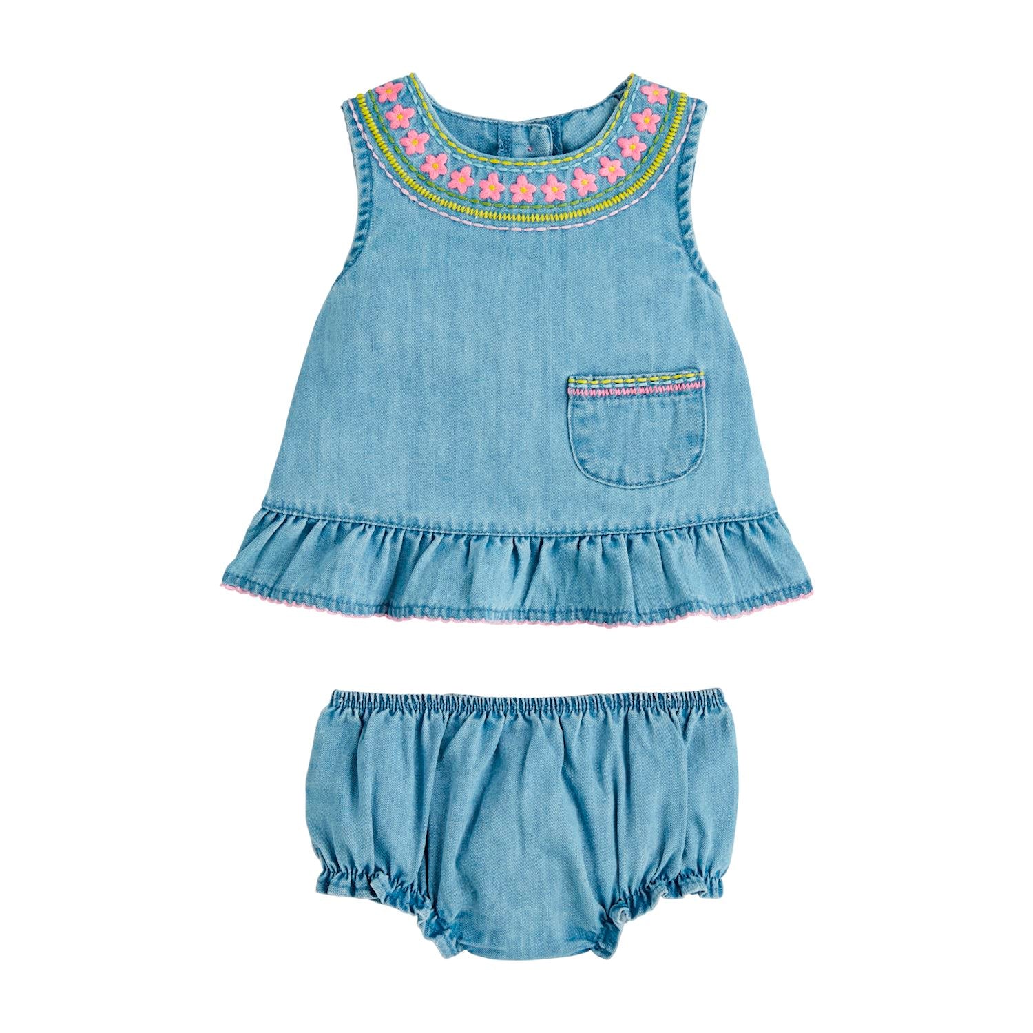 Embroidered Floral Denim Pinafore Set