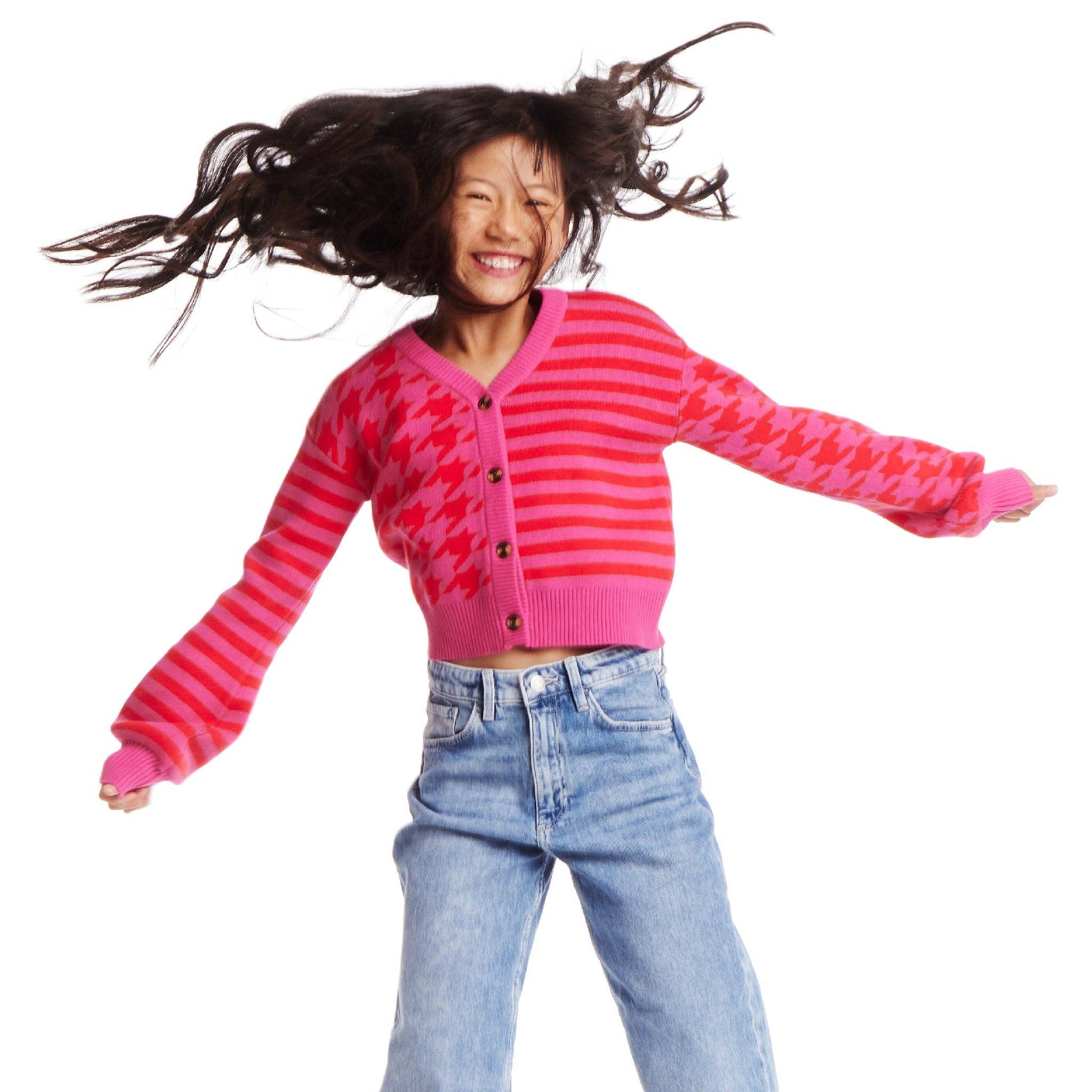 Infuse a dose of classic charm into your child’s outfit with the Kids Pink/Red Houndstooth/Stripe Cropped Cardigan. This stylish cardigan features a bold mix of houndstooth and stripes, creating a unique, eye-catching look.