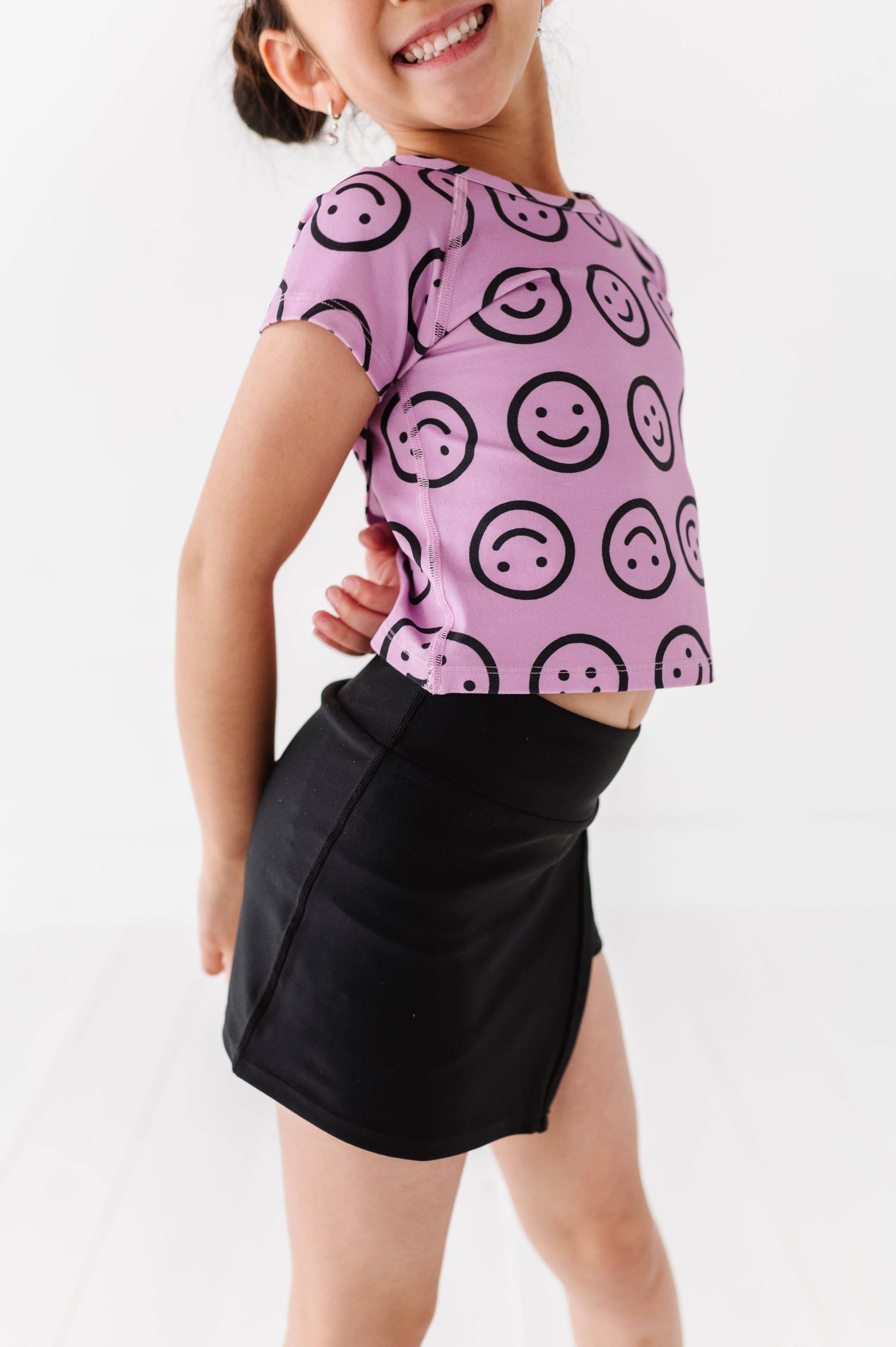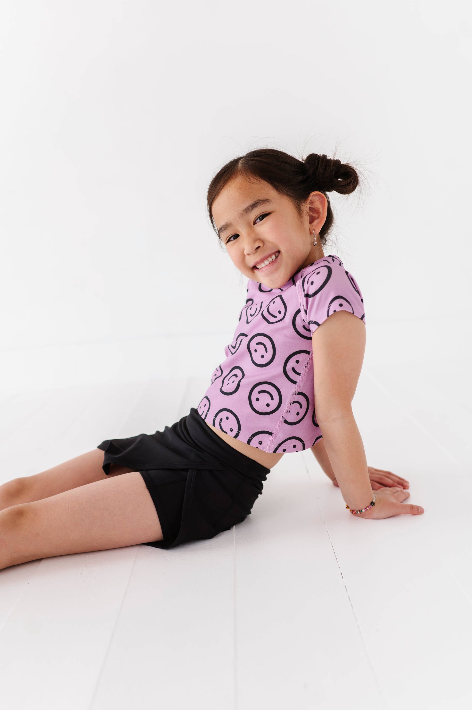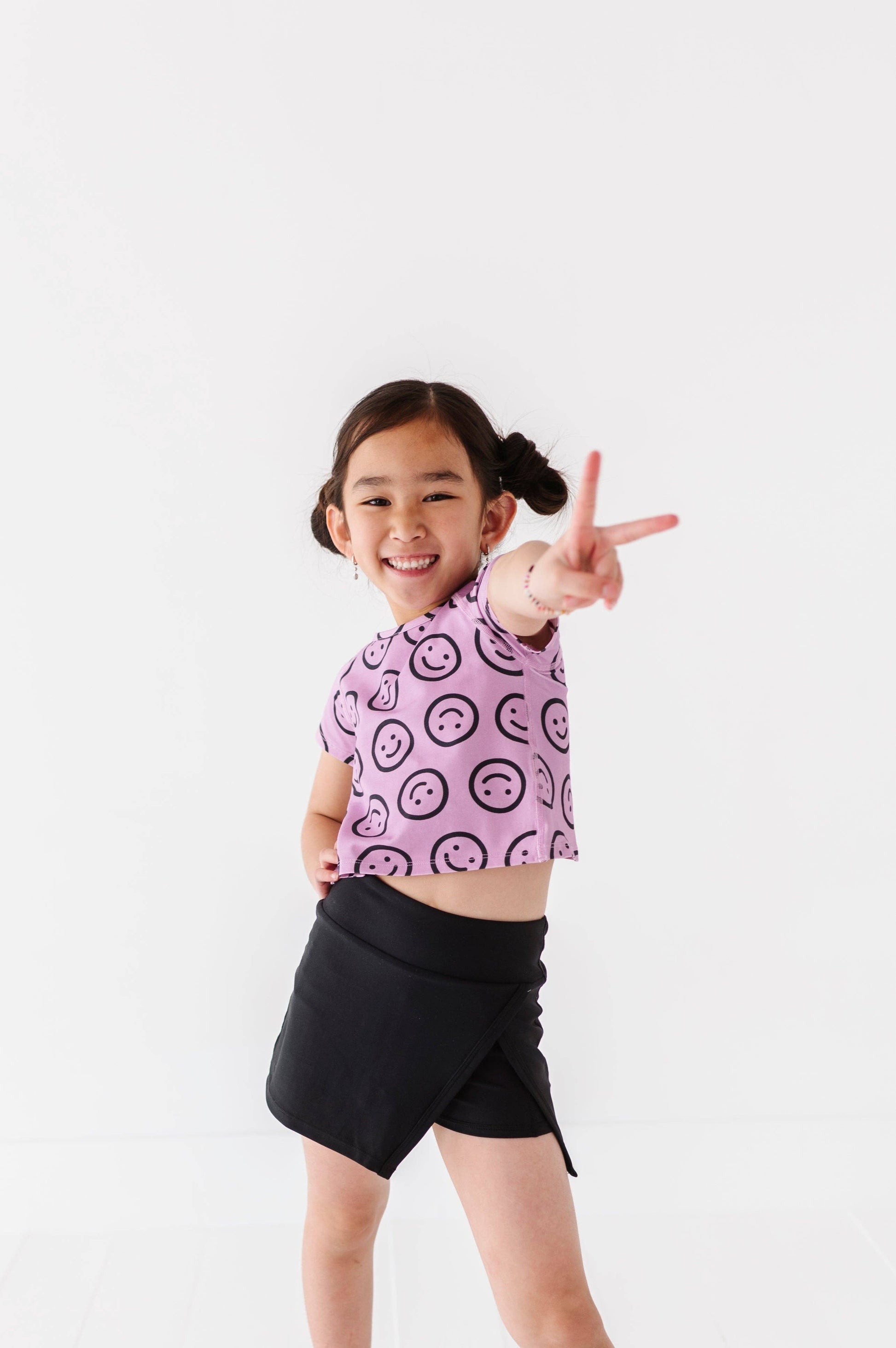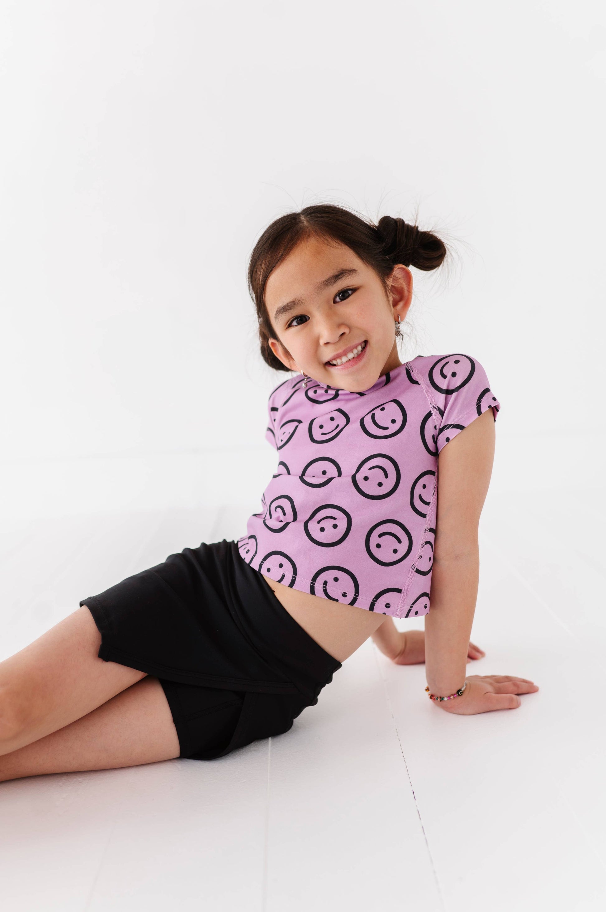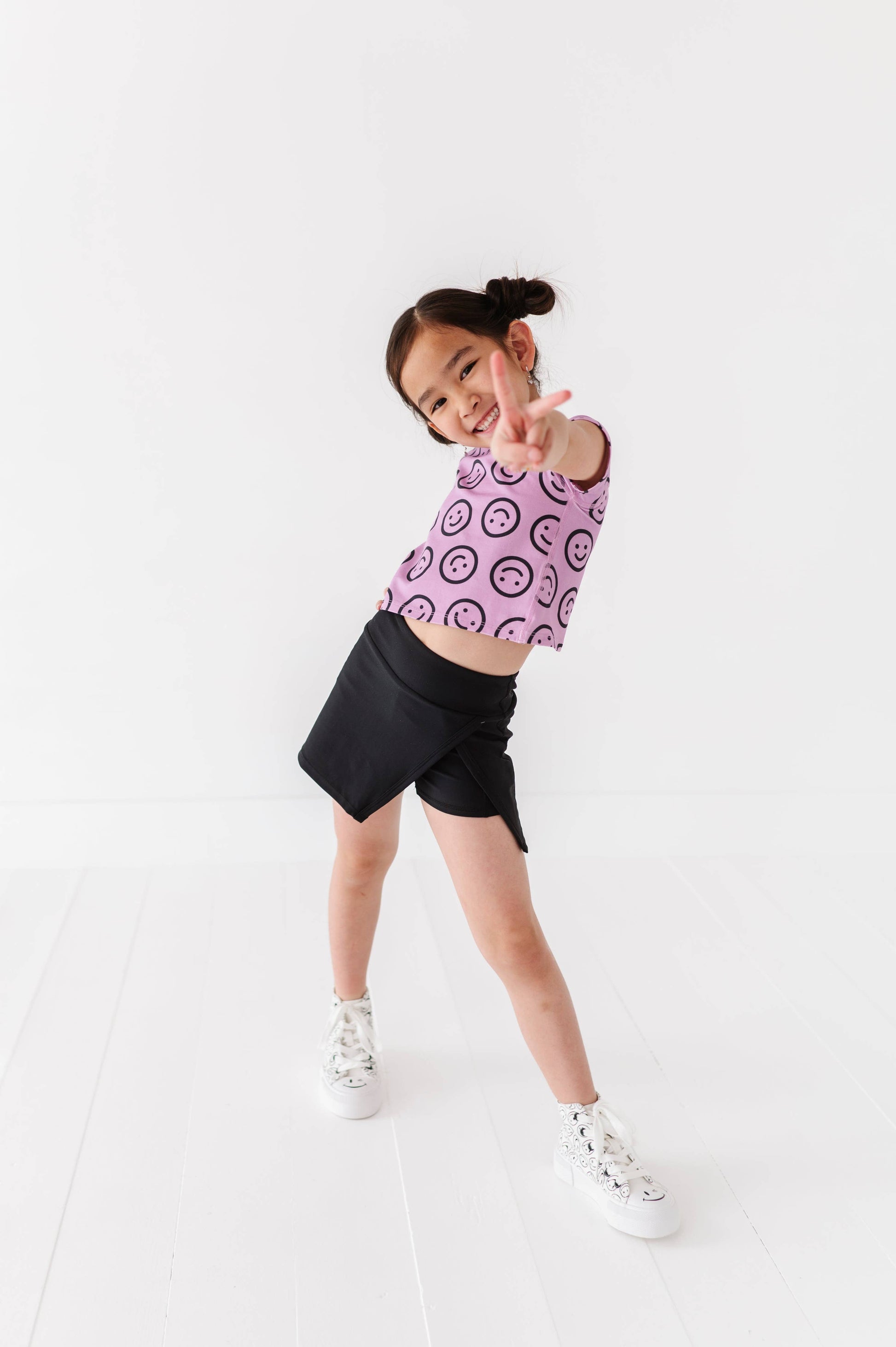 Our everyday activewear for your little girls to wear to the park, gymnastics, dance, cheer or just for an everyday comfy “on the go” look! THIS ITEM RUNS TRUE TO SIZE and is made to fit boxy/loose in the chest with a cropped length hitting at the top of the hips. Sizing recommendations are based off of this type of fit. If in-between sizes you can size up for a looser fit but also keep in mind that the chest/waist size of the item will increase as you size up. Our models are wearing their true sizes so sizing up might not fit like you see in our modeled pictures.