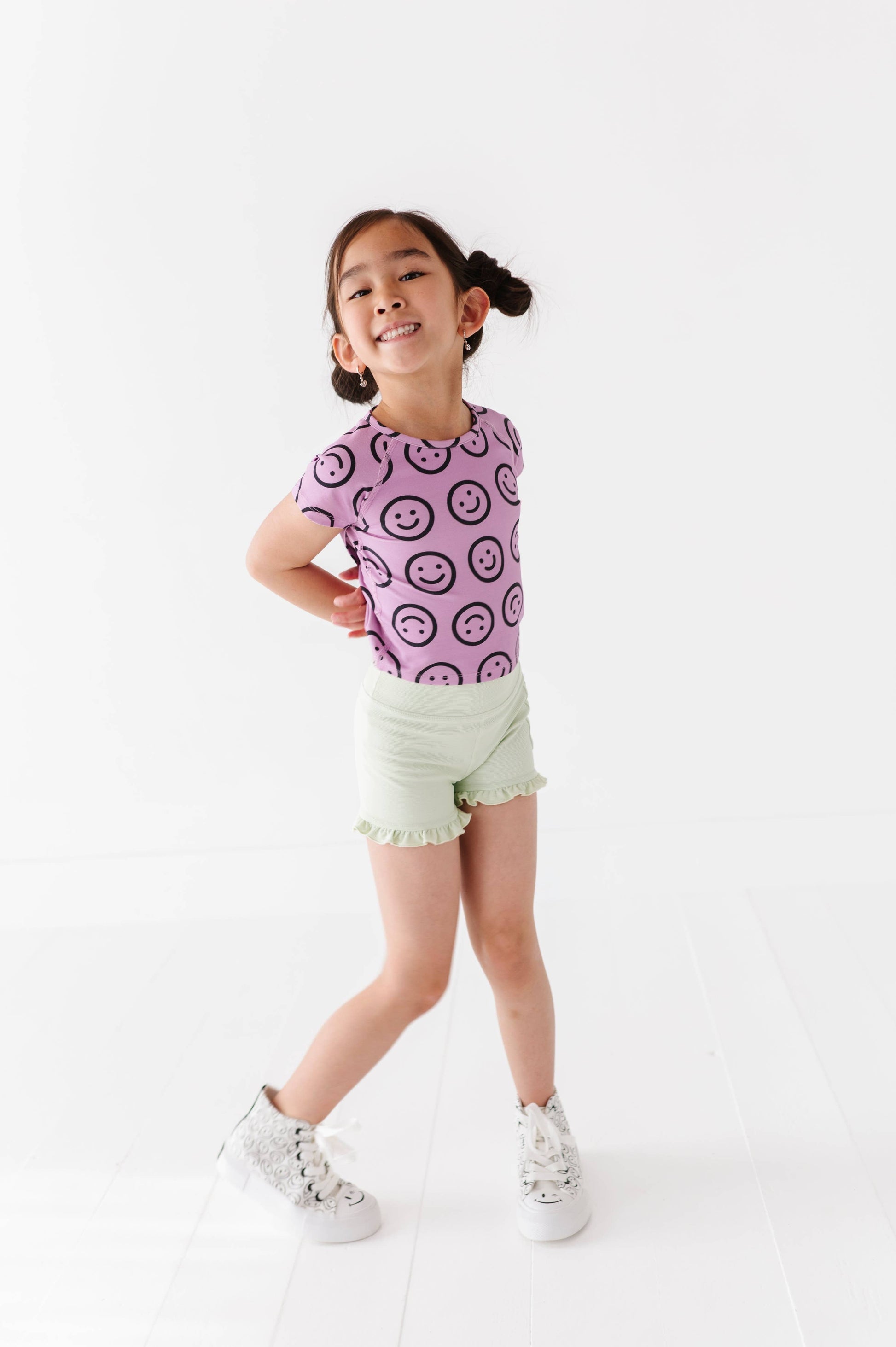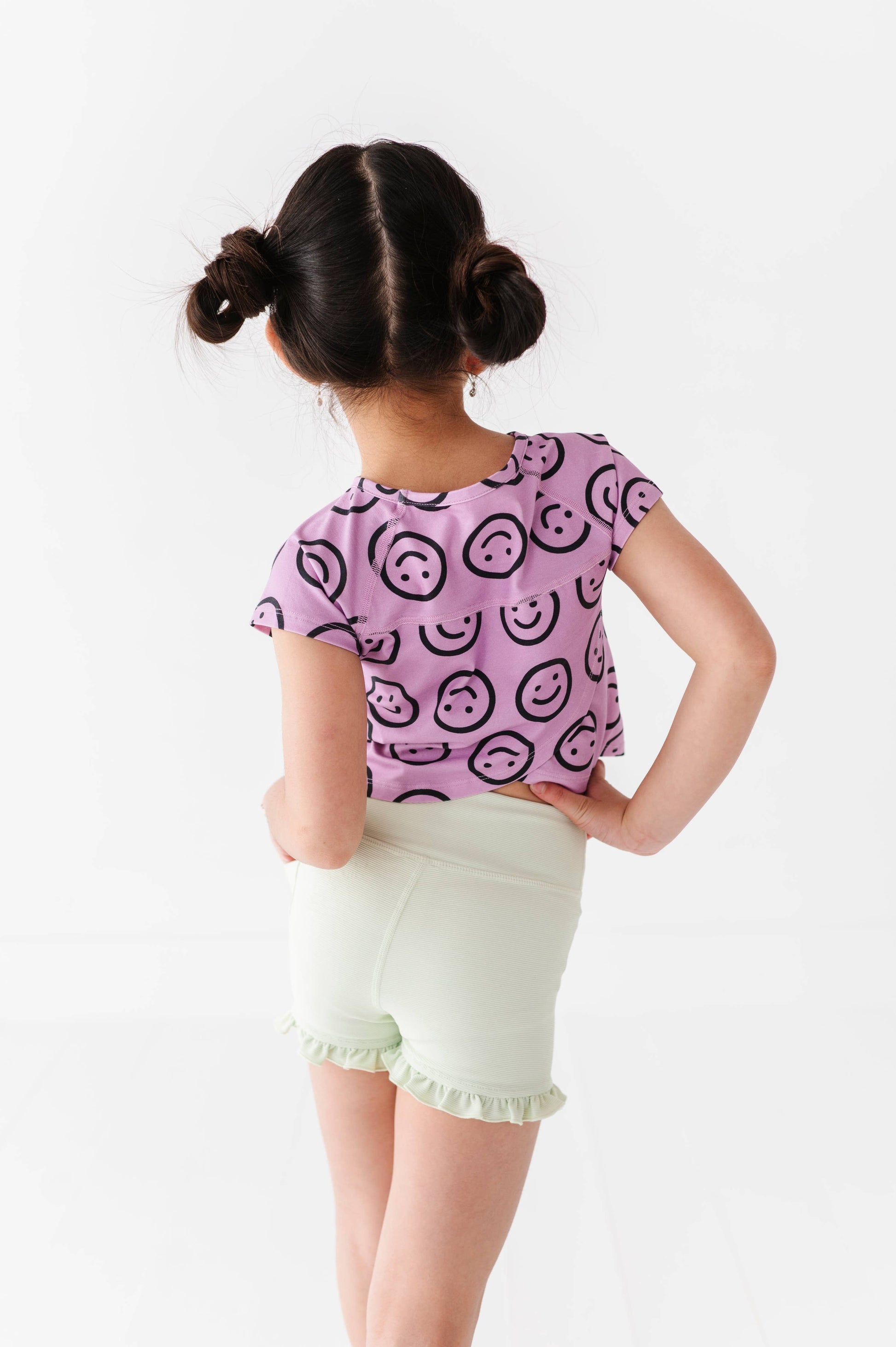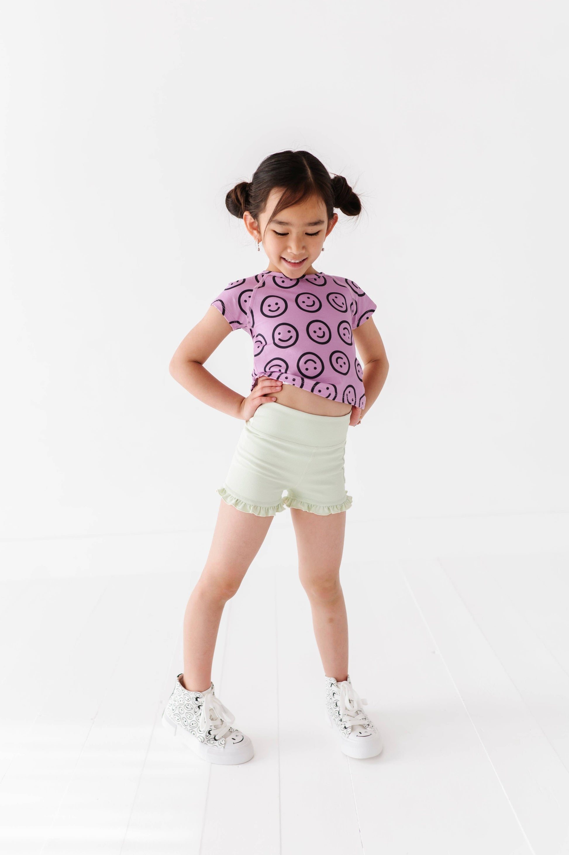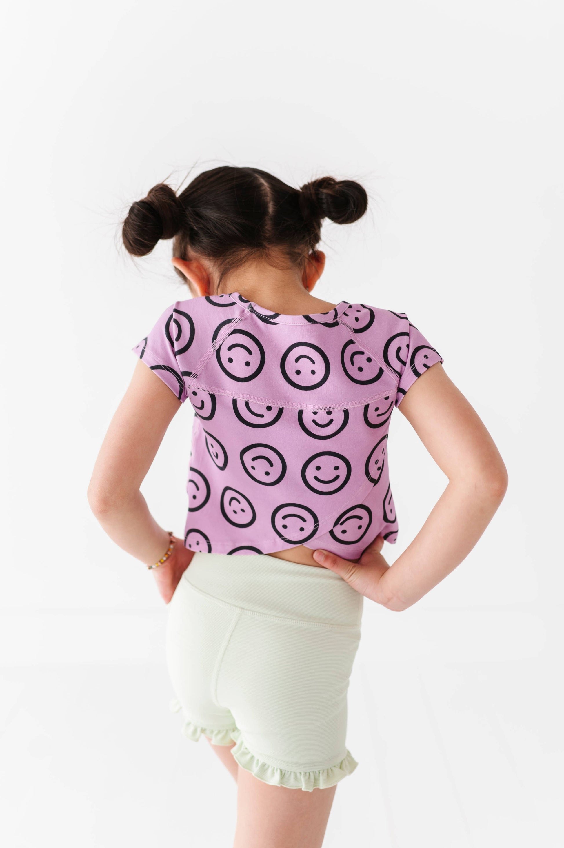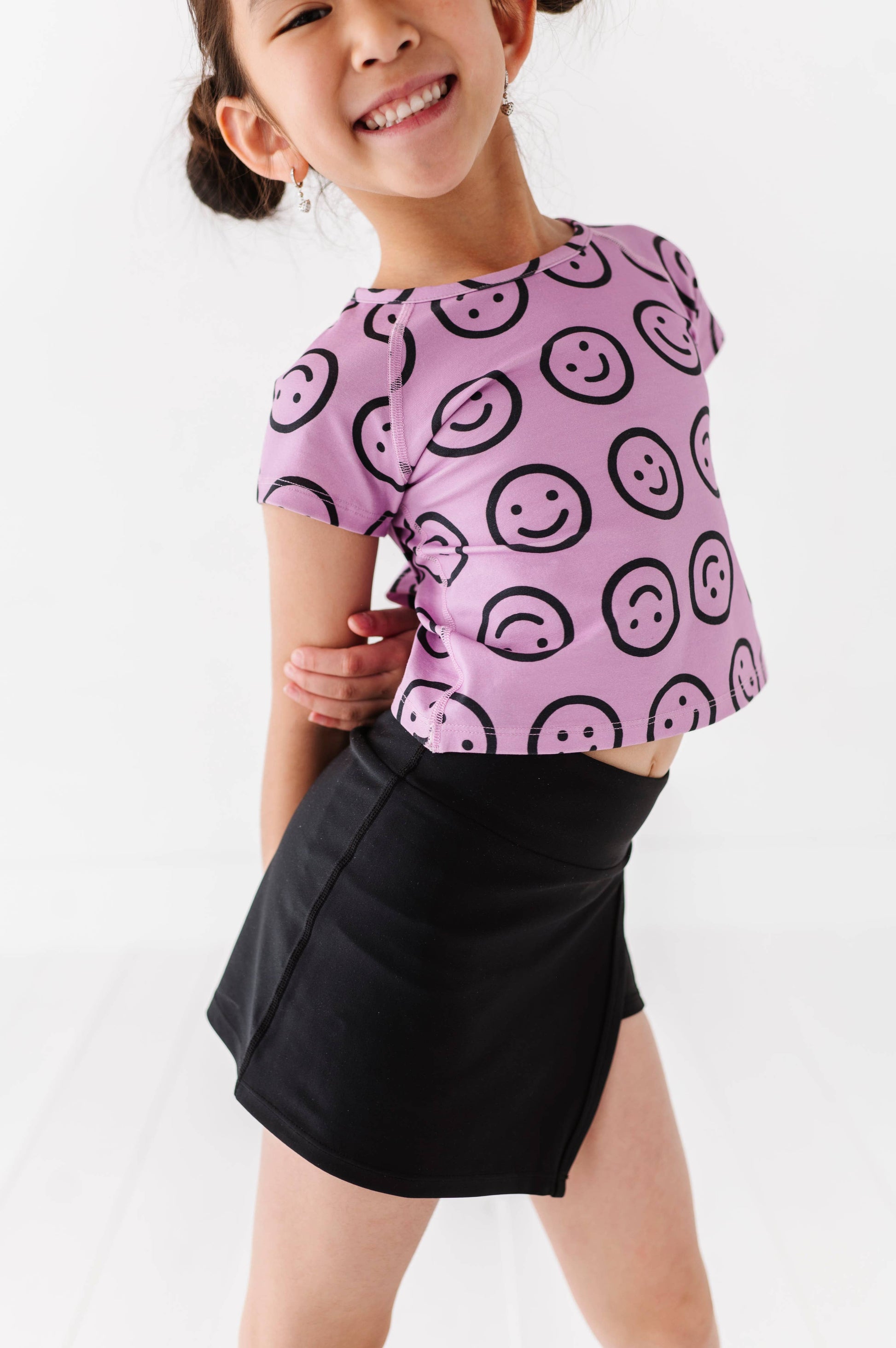 Our everyday activewear for your little girls to wear to the park, gymnastics, dance, cheer or just for an everyday comfy “on the go” look! THIS ITEM RUNS TRUE TO SIZE and is made to fit boxy/loose in the chest with a cropped length hitting at the top of the hips. Sizing recommendations are based off of this type of fit. If in-between sizes you can size up for a looser fit but also keep in mind that the chest/waist size of the item will increase as you size up. Our models are wearing their true sizes so sizing up might not fit like you see in our modeled pictures.