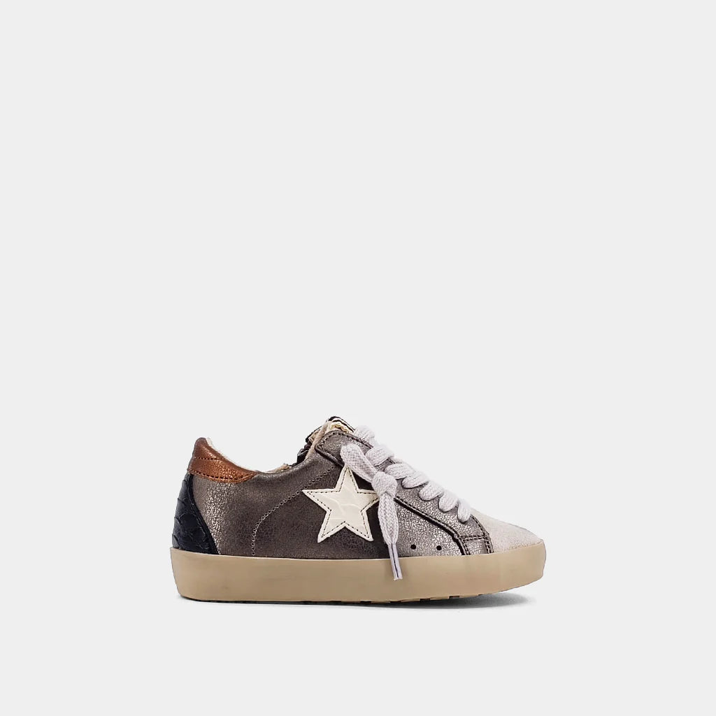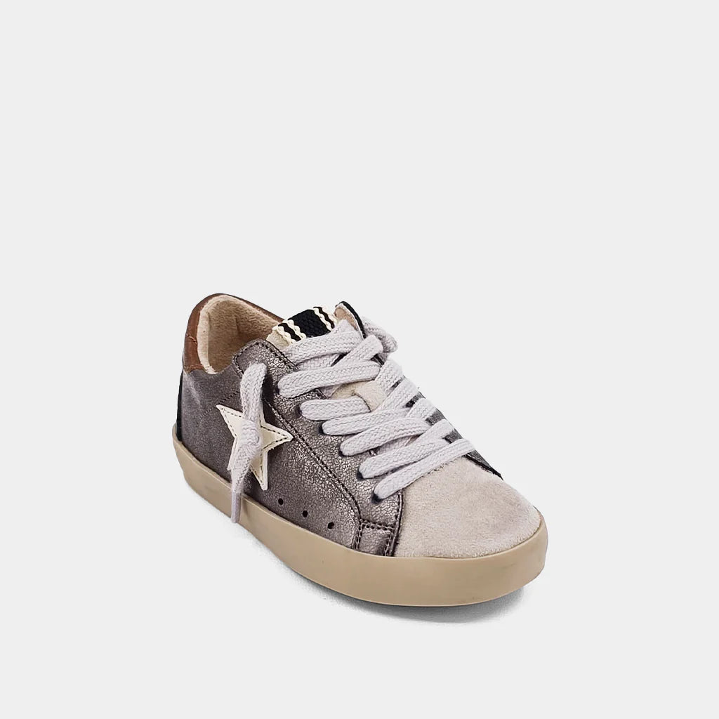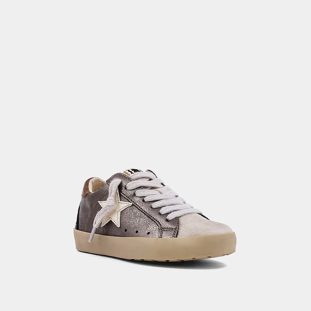 Our Mommy and Me collection features fun-sized versions of our best-selling sneakers. Don't miss out on this chance to match your little one's outfit with the coolest kicks. One of our favorite must-have retro sneakers is PAZ, with a low-top upper body crafted in faux iridescent leather and glitter in silver, lilac, and white. These sneakers look amazing paired with shorts, cropped jeans, and dresses. ShuShop