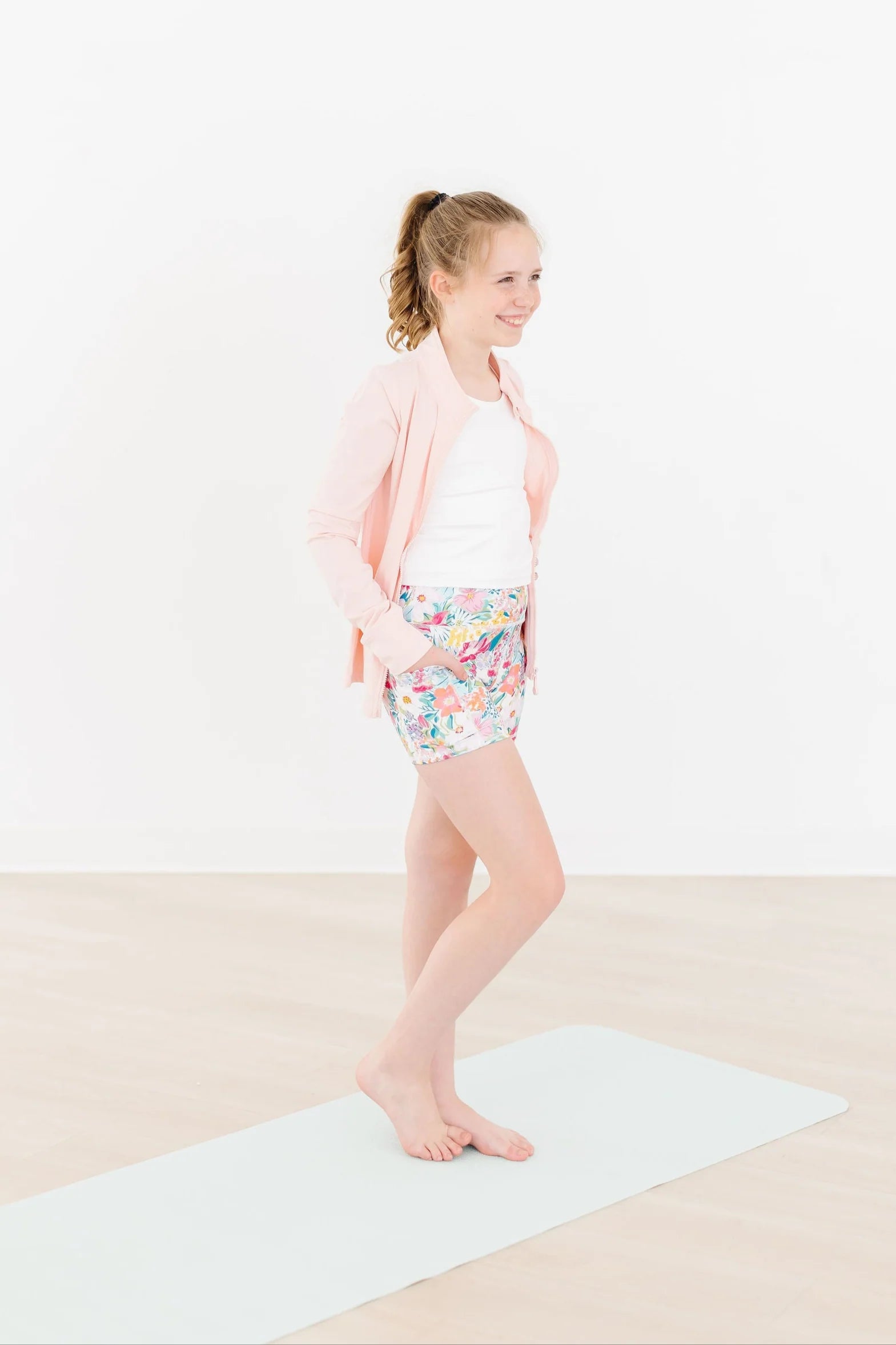 It’s finally here! An active line made for dance, cheer, yoga workouts or just lounging at home. She will love the comfort and stretch of this legging. You will love the easy care. The line is made to mix and match or buy all 3 pieces in her favorite color in the jacket and shorty shorts. #ActiveMila