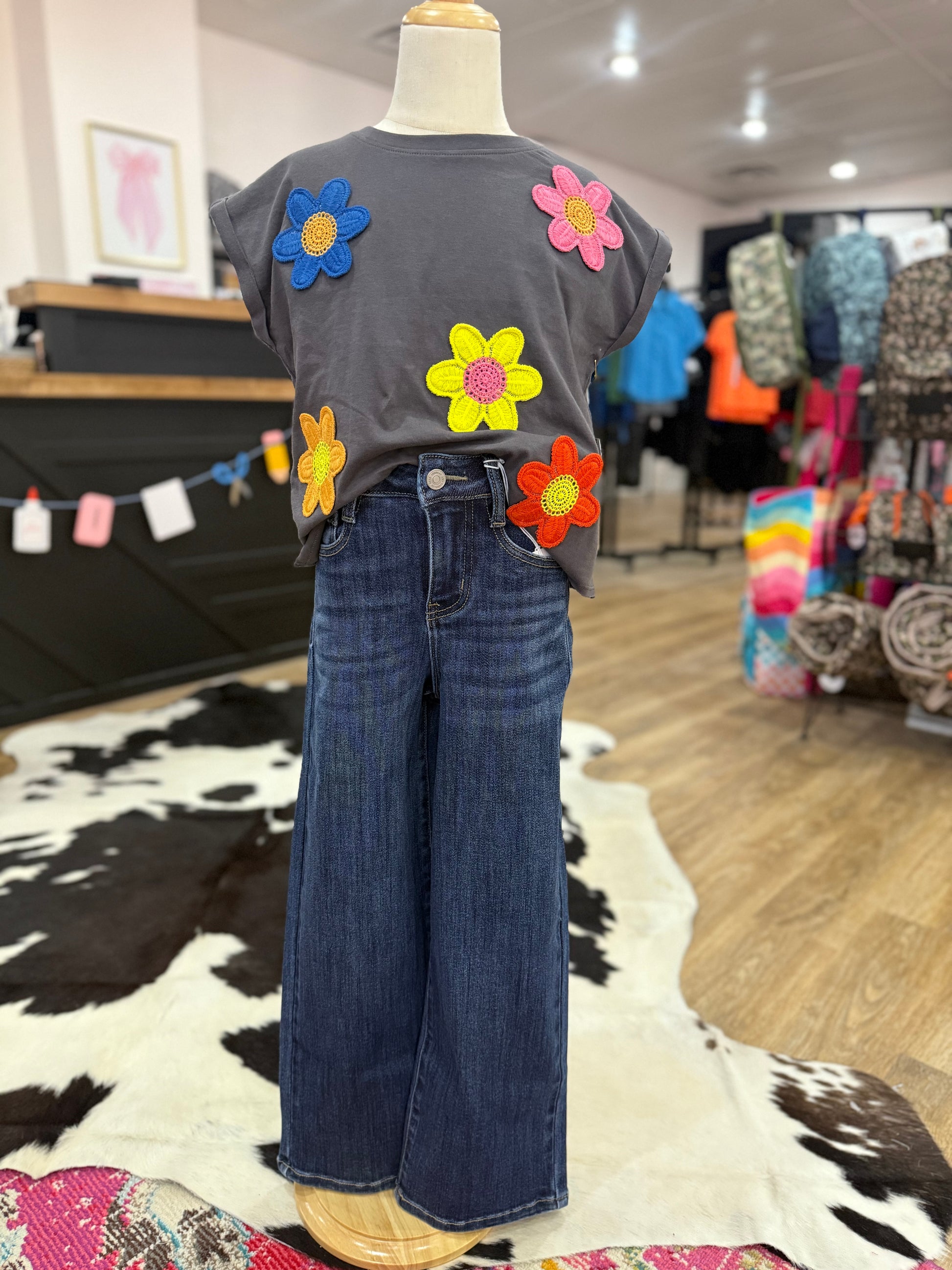 HIGH RISE WIDE LEG JEANS DARK WASH STRETCH NON DISTRESSED 5 POCKETS STYLES REGULAR HEM ZIP FLY RISE 9.5" INSEAM 25" WAISTBAND 1.5" IN SIZE 10 65.4% COTTON, 30.3% POLYESTER, 3% RAYON,1.3% SPANDEX 12.7 OZ