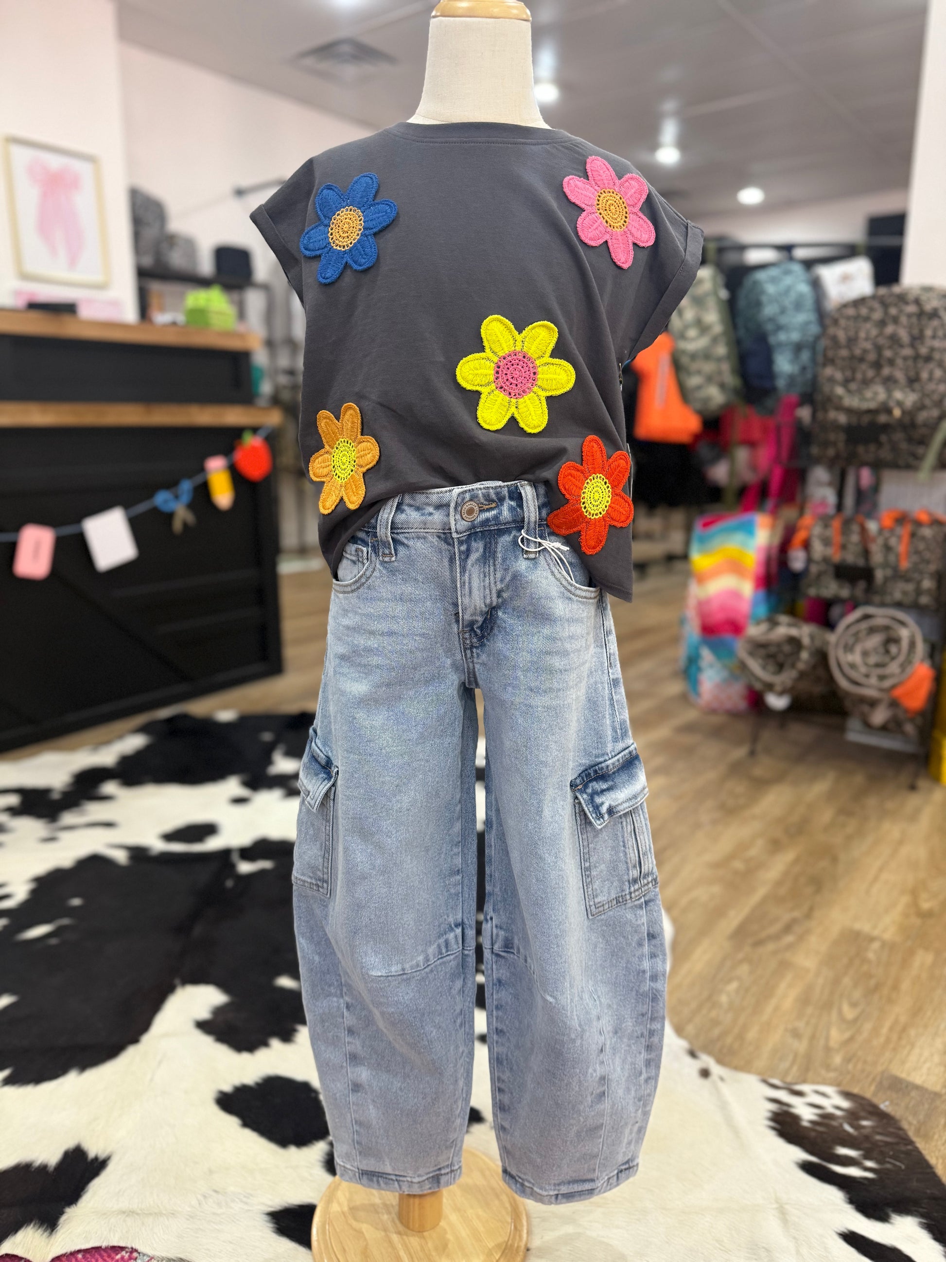 LOW SLUNG HORSESHOE FIT JEANS MEDIUM WASH COMFORT STRETCH 5 POCKET STYLE DART DETAILS CARGO POCKETS WORN LOW ON THE WAIST OVERSIZED FIT WITH A BARREL LEG & TAPERED BOTTOM RISE 8 5/8" INSEAM 24 1/2" WB 1 1/2" IN SIZE 10 99% COTTON, 1% SPANDEX 13.5 OZ